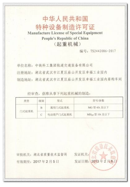 详细摘要: 中华人民共和国特种设备制造许可证门式起重机C级